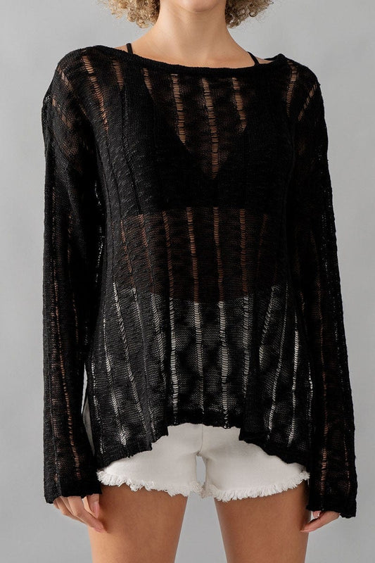 Whispering Threads Sheer Knit Long Sleeve Lace Distressed Sweater Fashion Knitwear