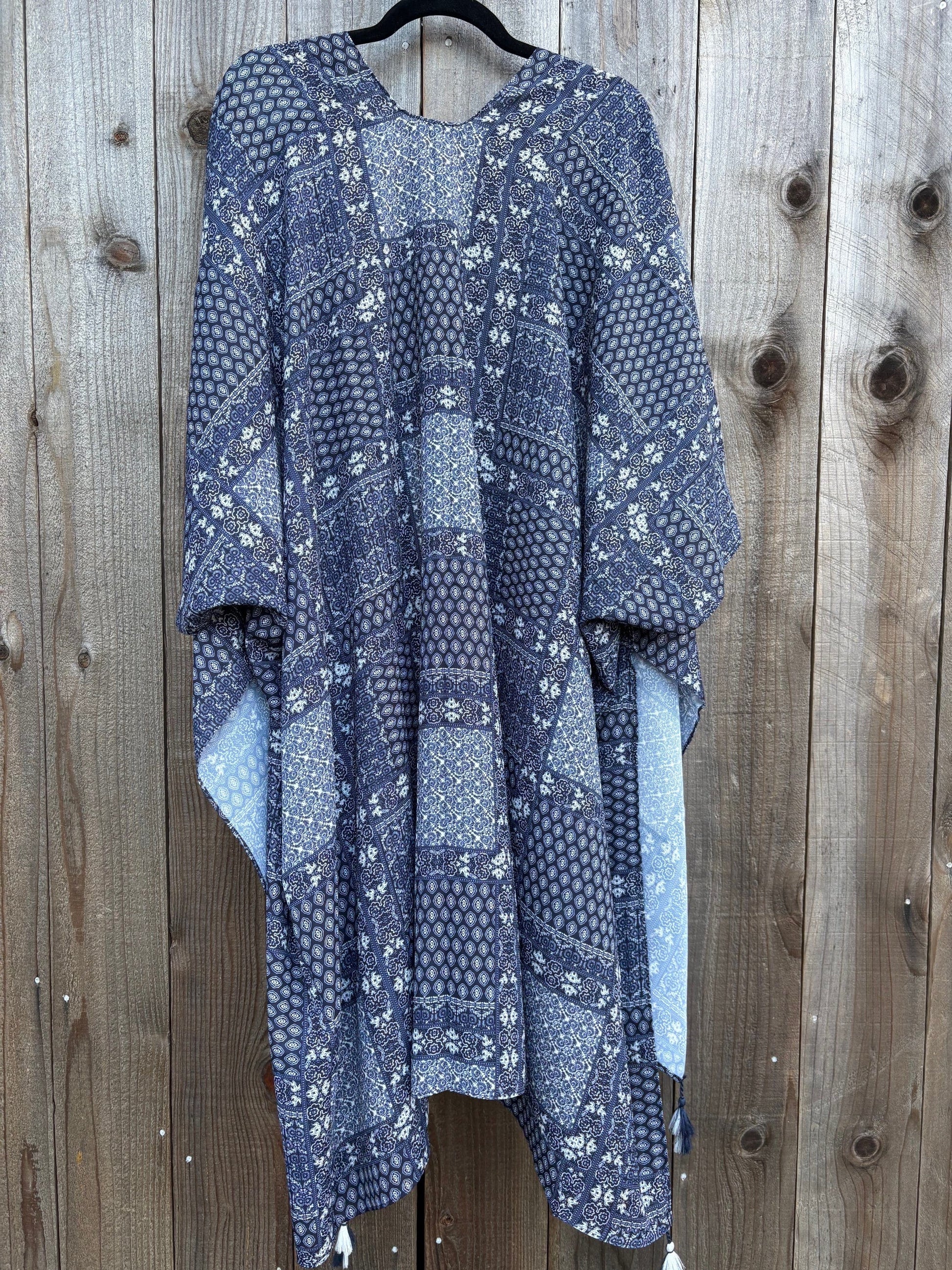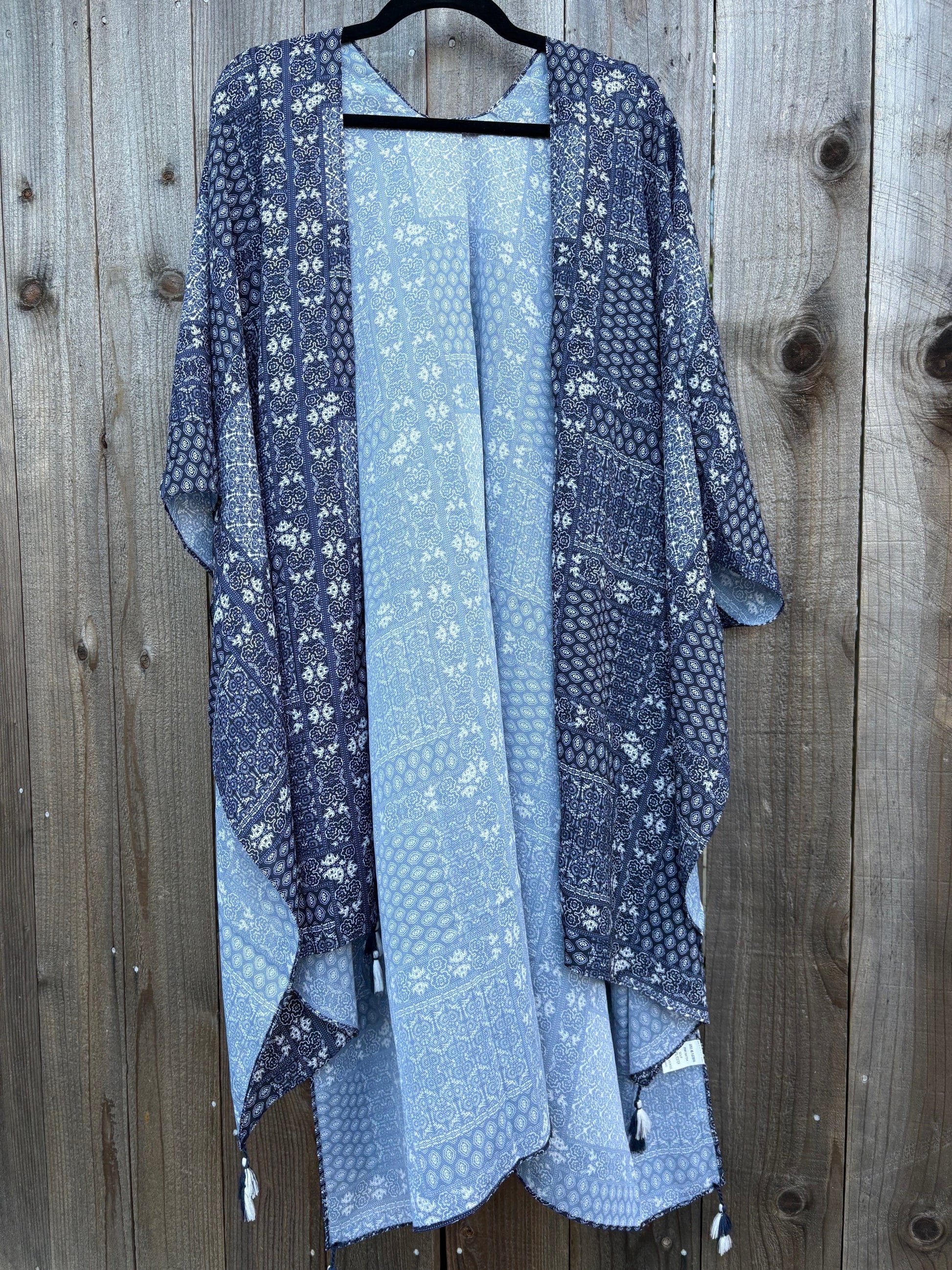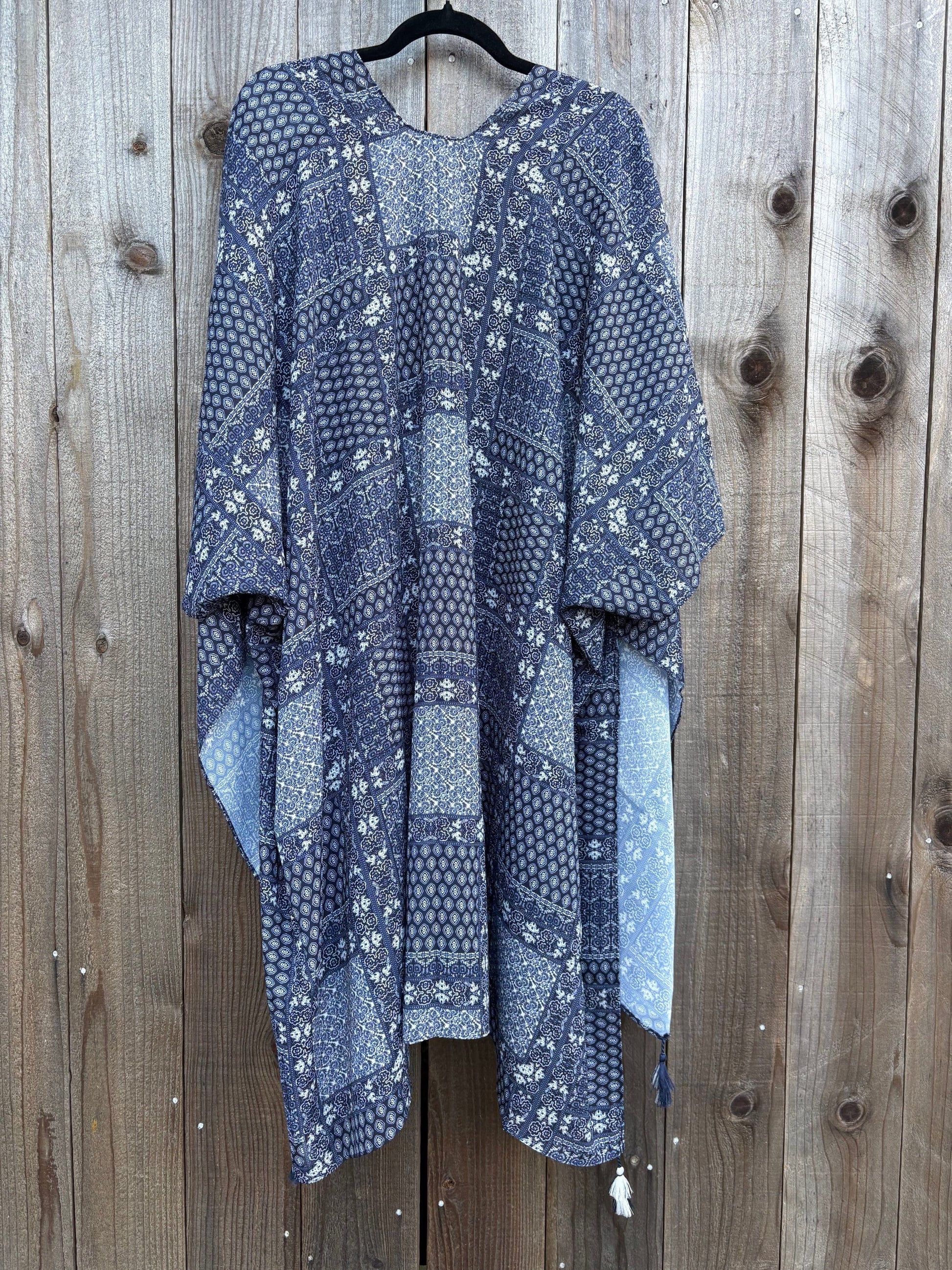 David & Dani Blue and White Kimono Cover Up with Tassles
