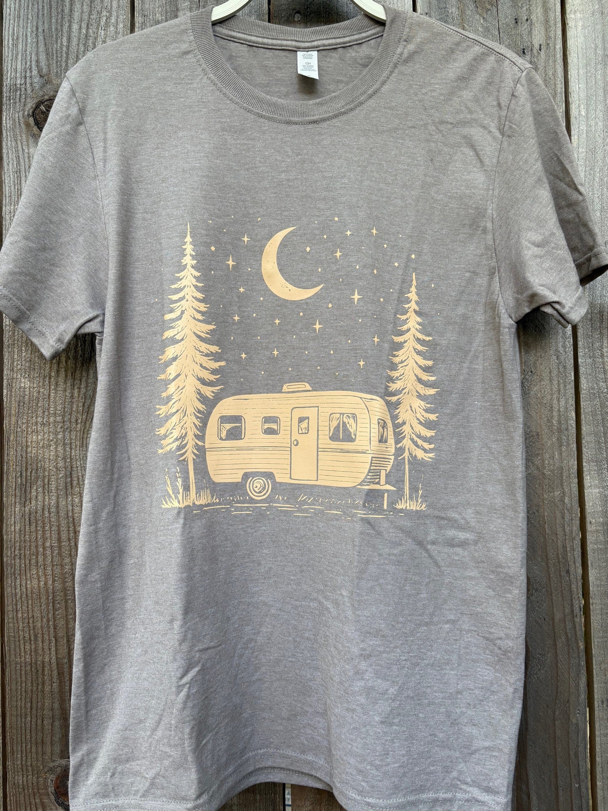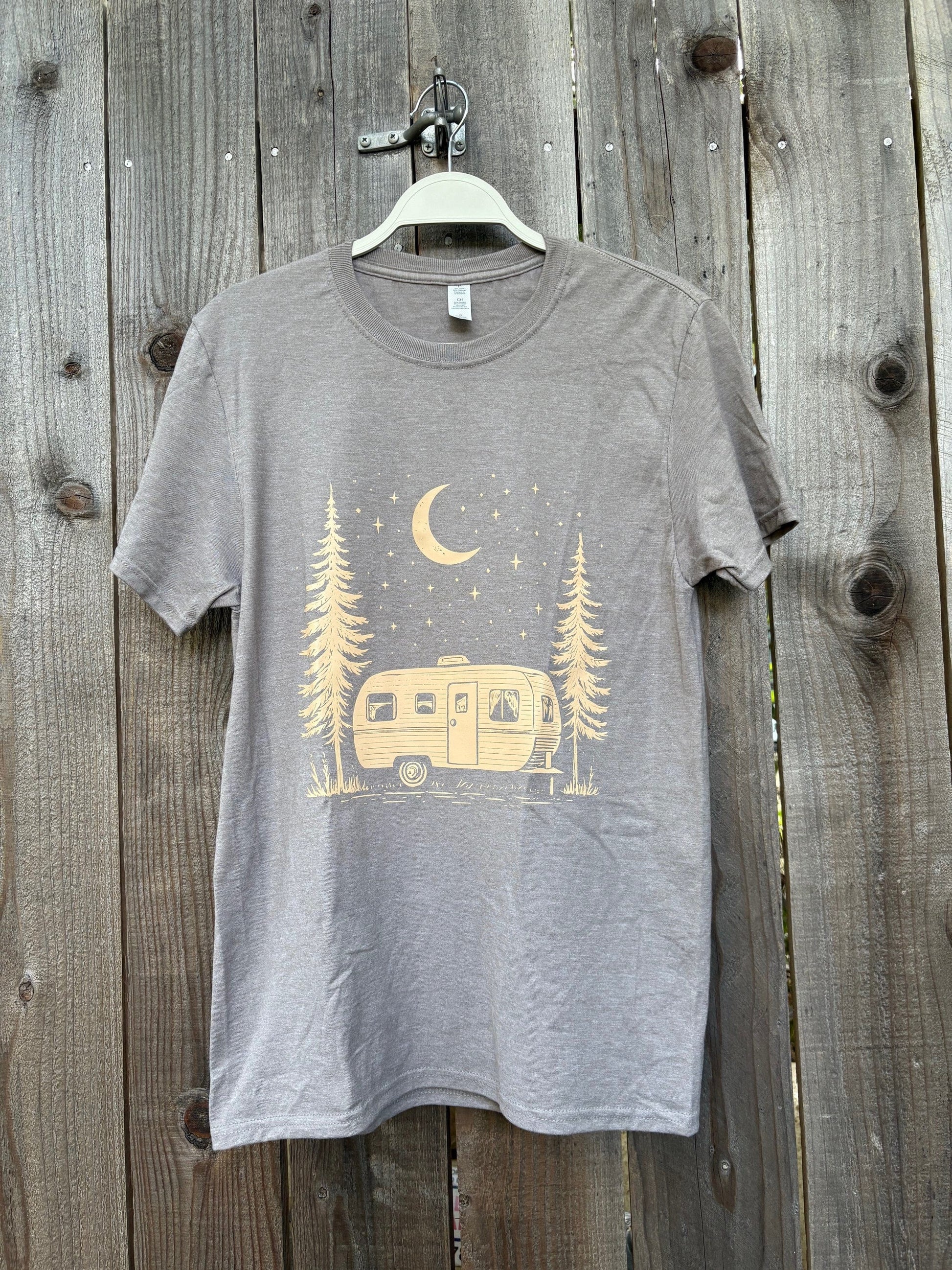 Embrace the call of the wild in our Scenic Camping Nights tee! This sandstone brown shirt features a dreamy cream graphic of a cozy camper nestled among trees under a sliver moon. Perfect for adventure enthusiasts or anyone who'd rather be toasting marshmallows under the stars. Wear your outdoor spirit even when you're stuck indoors!