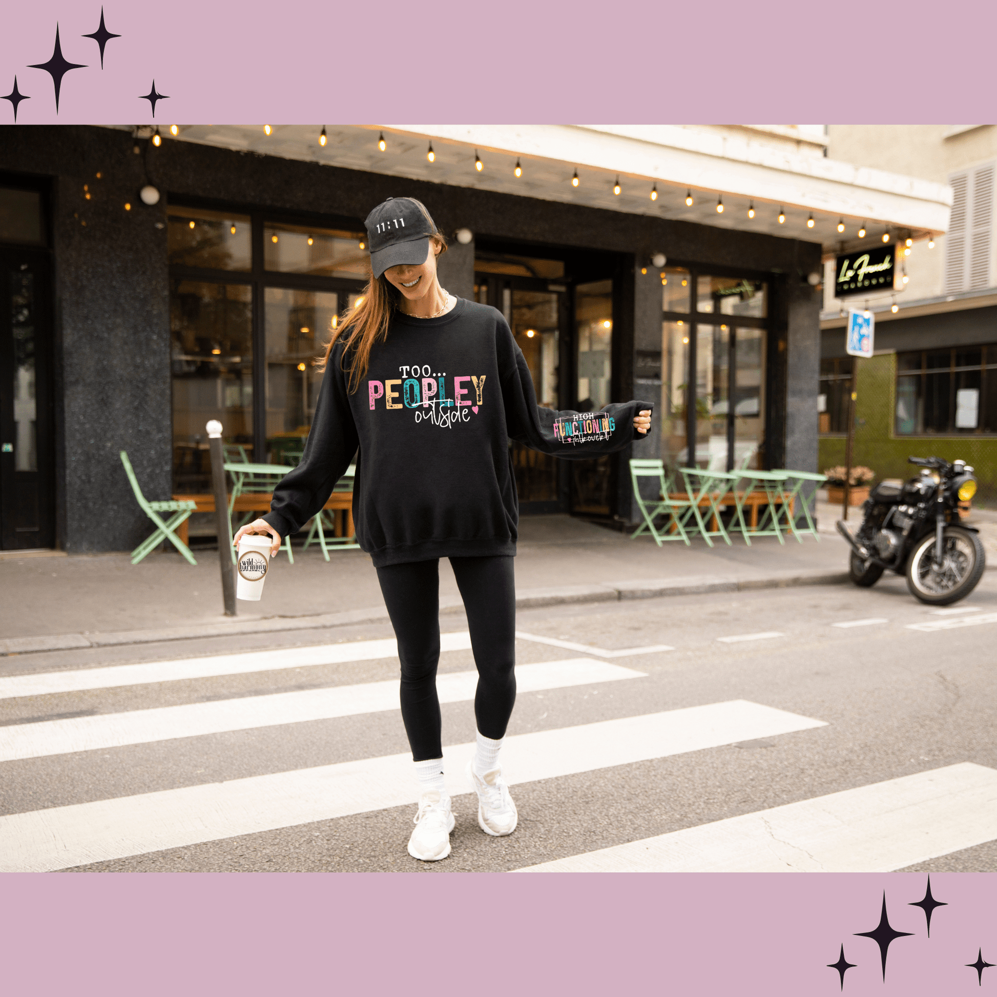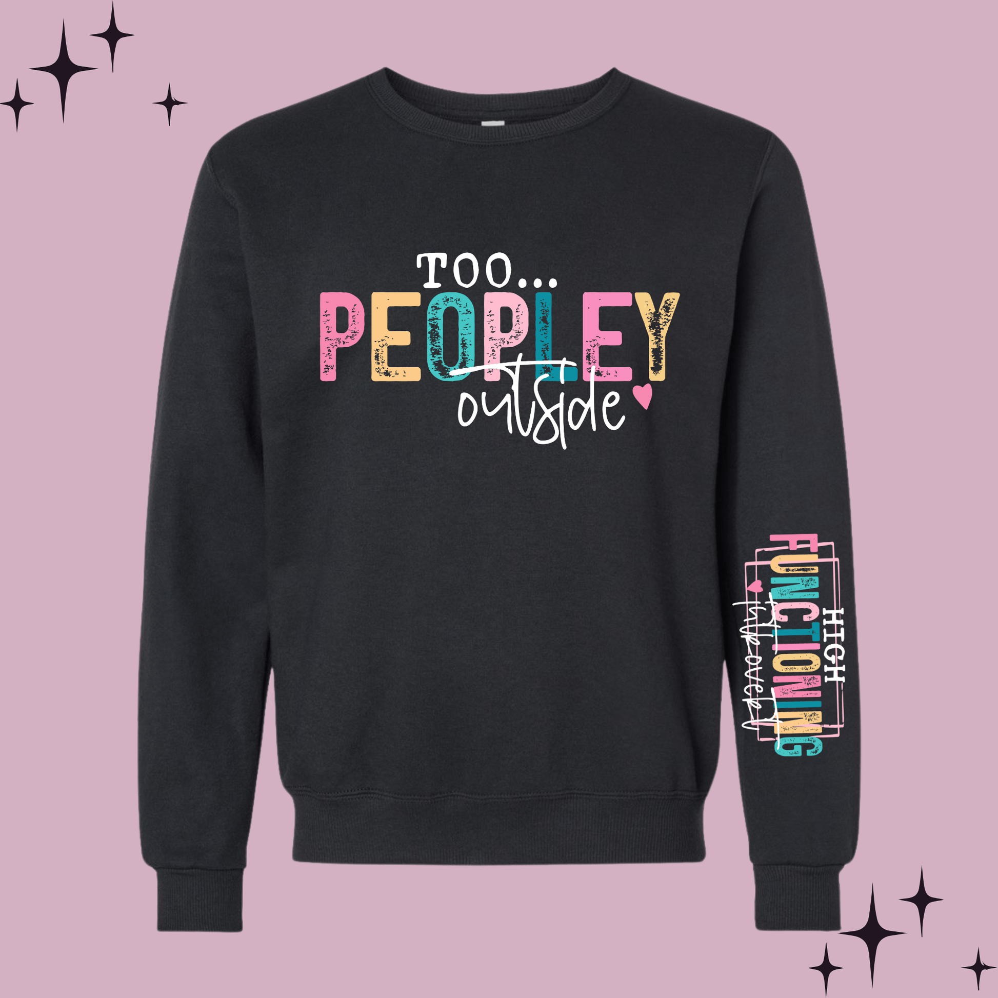 Embrace your introverted side with this quirky and cozy sweatshirt. Featuring 'Too Peopley Outside' on the front and 'High Functioning Introvert' on the sleeve, it's the perfect way to express your need for alone time in a fun way! Made with a soft black fabric, it's the ultimate comfort piece for all your introverted adventures. No need to hide indoors anymore!