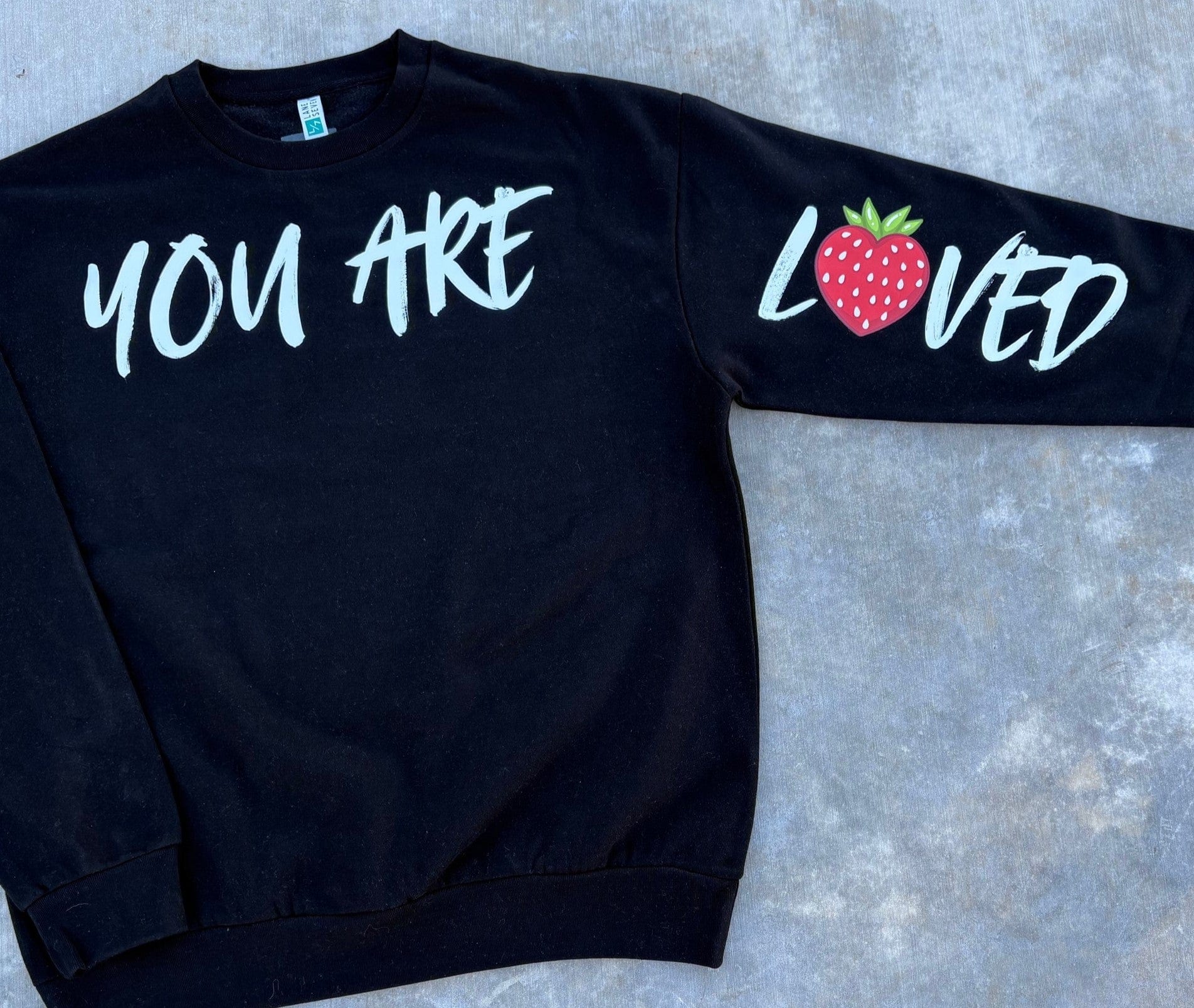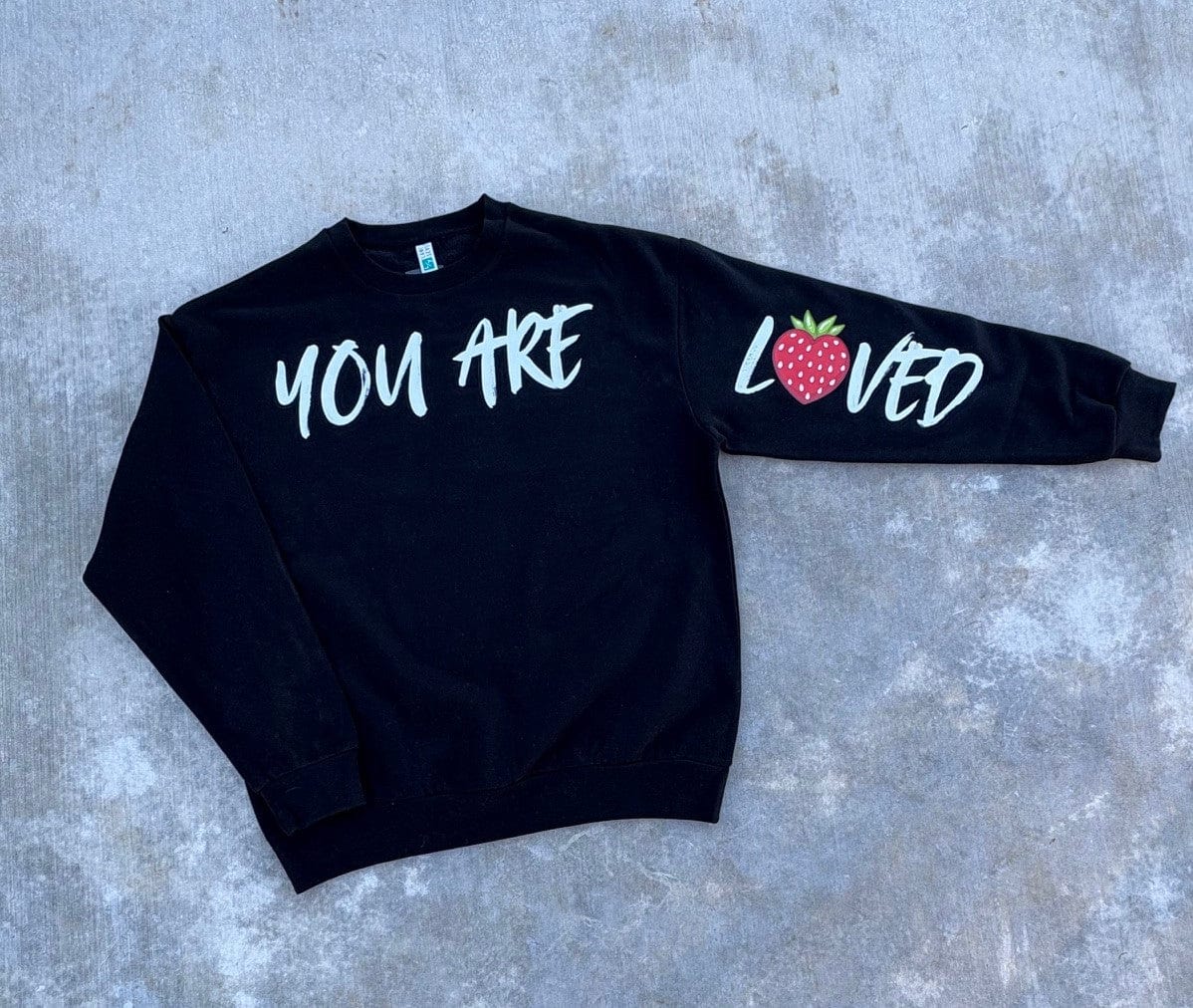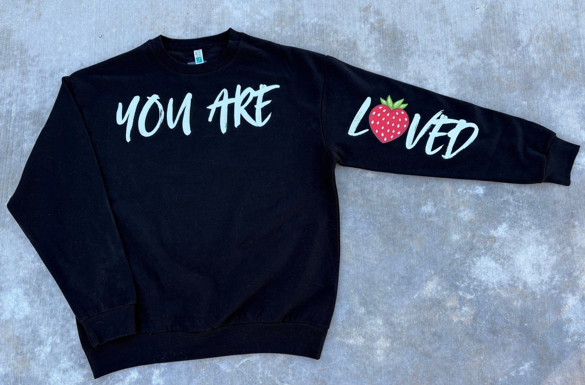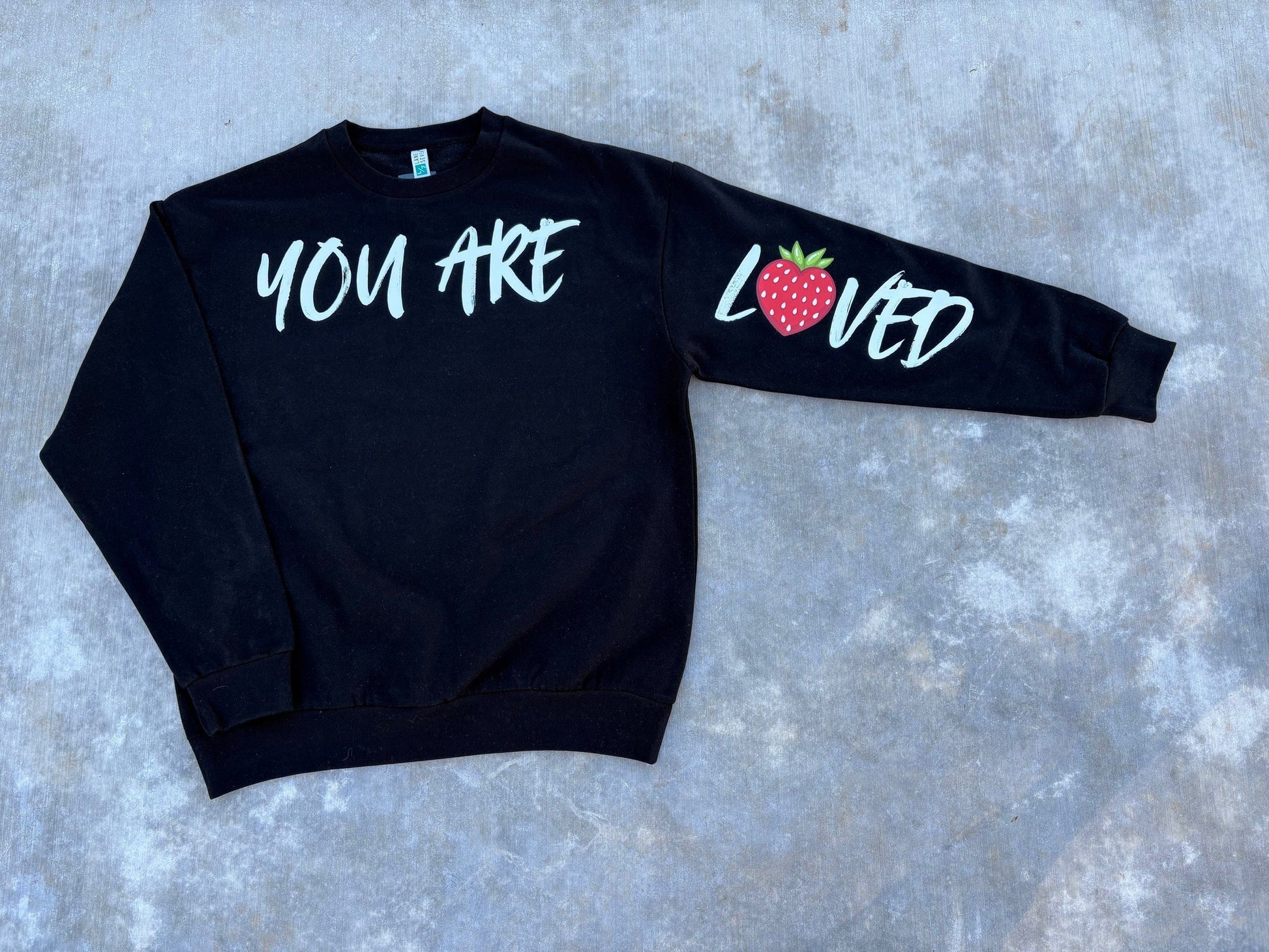 Spread some love with our "You are so loved" oversized print on a black crewneck sweatshirt! Featuring a playful strawberry for the "O" in loved, this urban sweatshirt boasts an oversized print across the chest and down the left sleeve. Shout out your love in cozy, streetwear style!