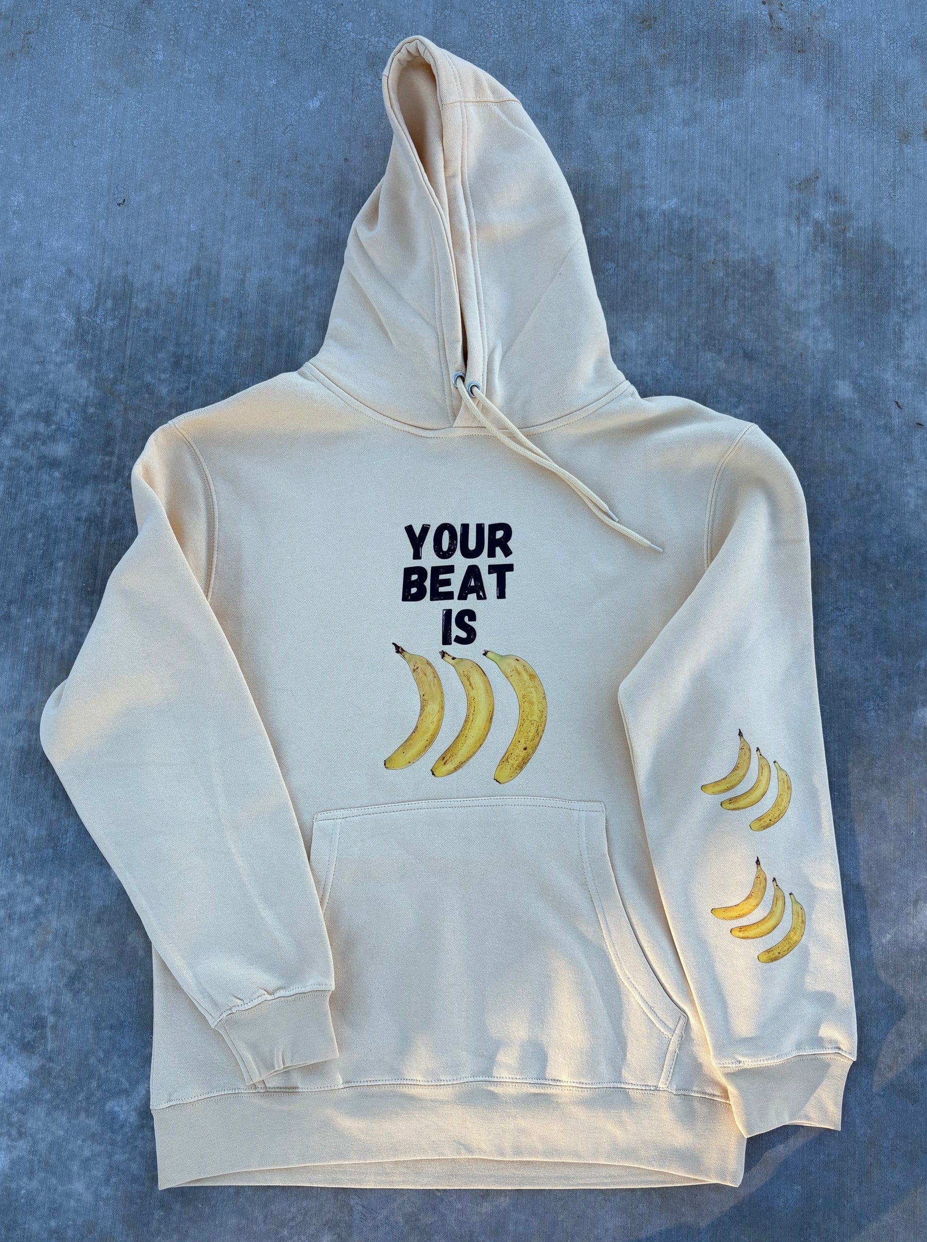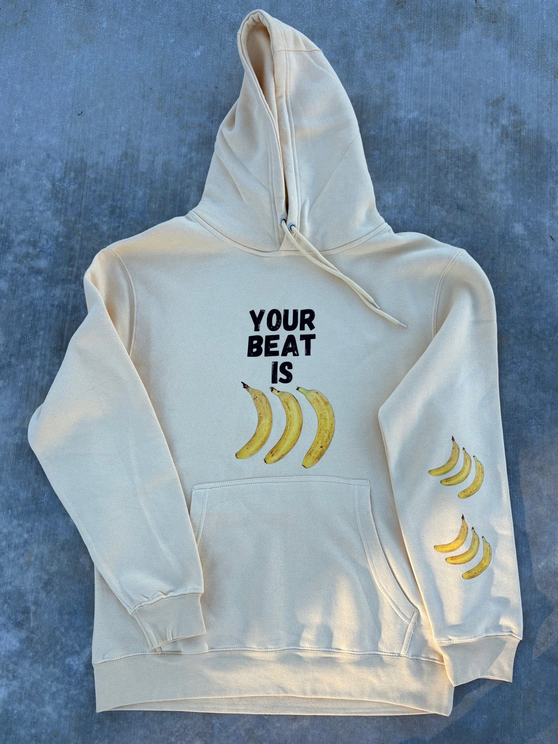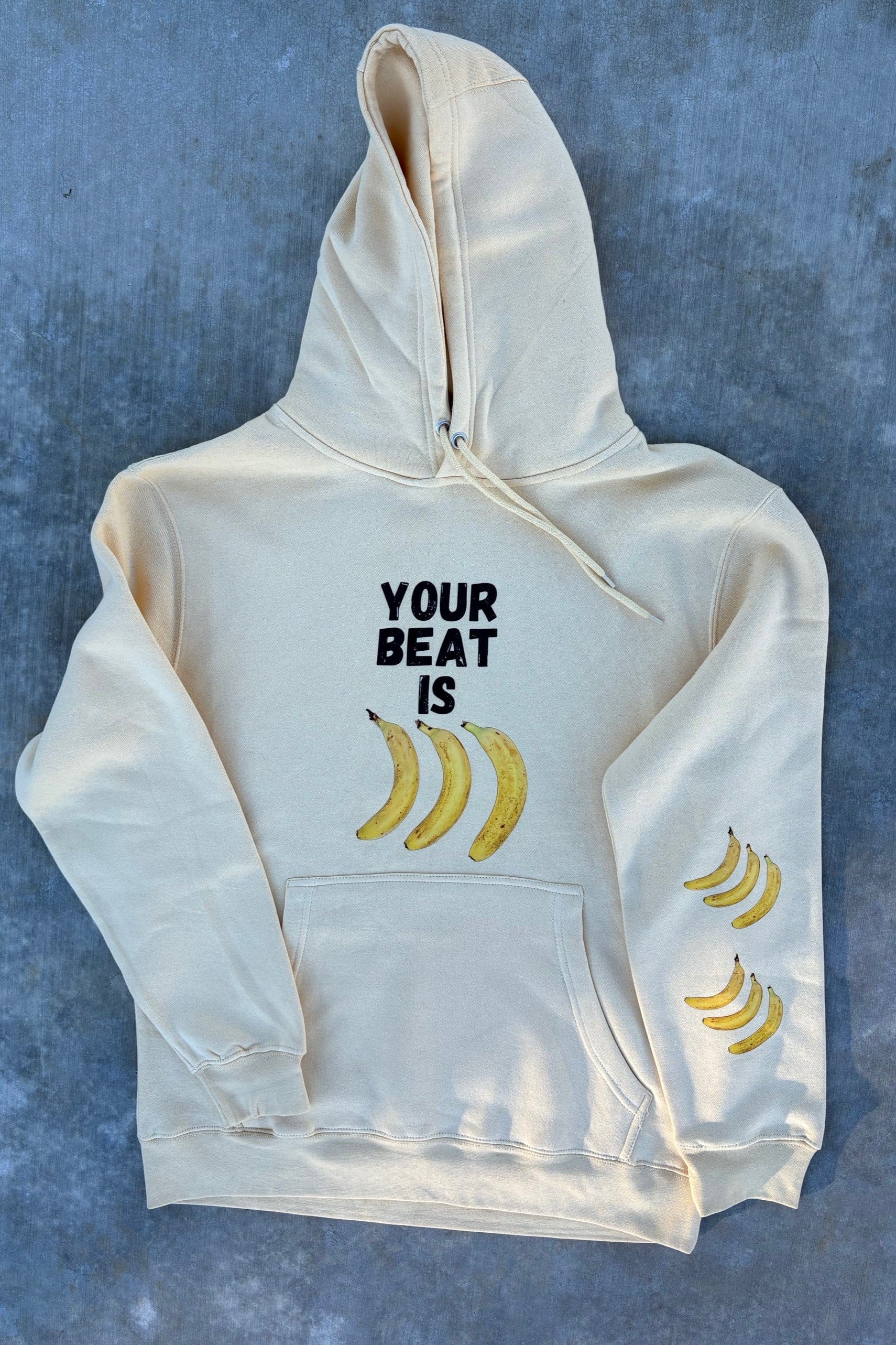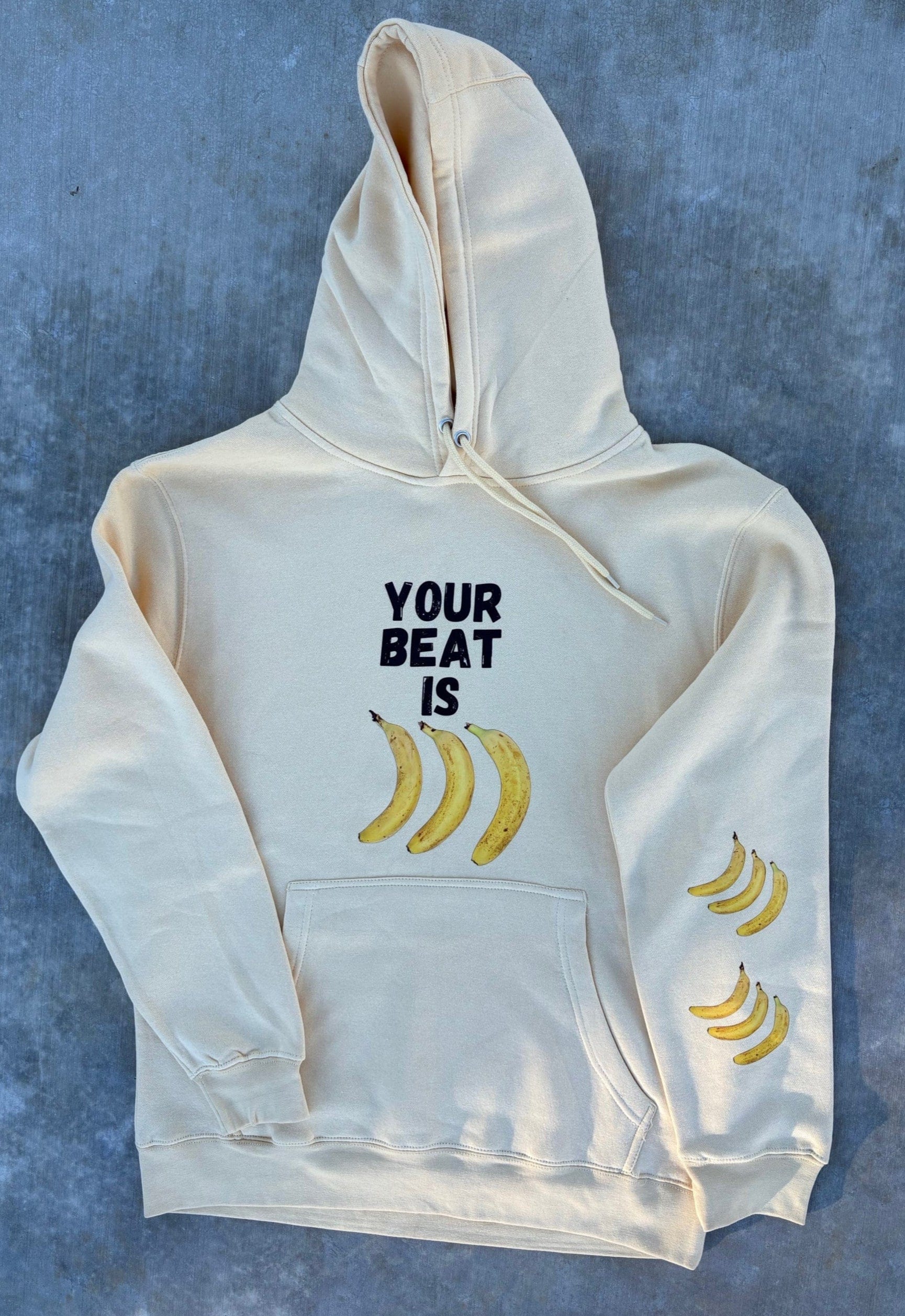 Get ready to groove in our "Your Beat is Bananas" hoodie! With a playful design of bananas on the front and sleeve, this pale yellow hoodie is perfect for those who don't take themselves too seriously. Made from super soft, responsibly sourced material, it's a quirky and fun addition to any wardrobe.